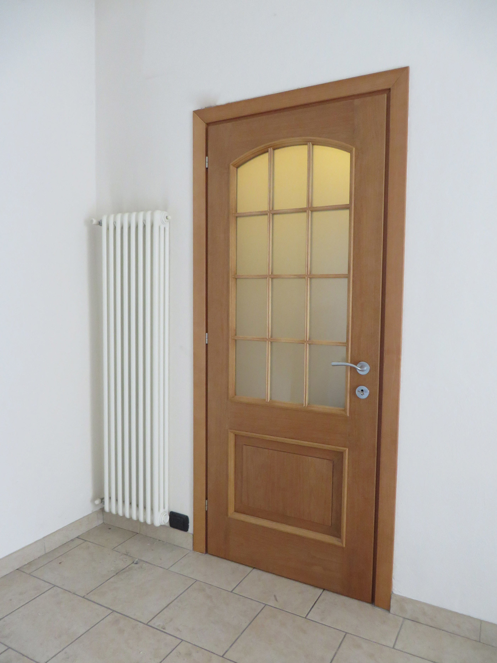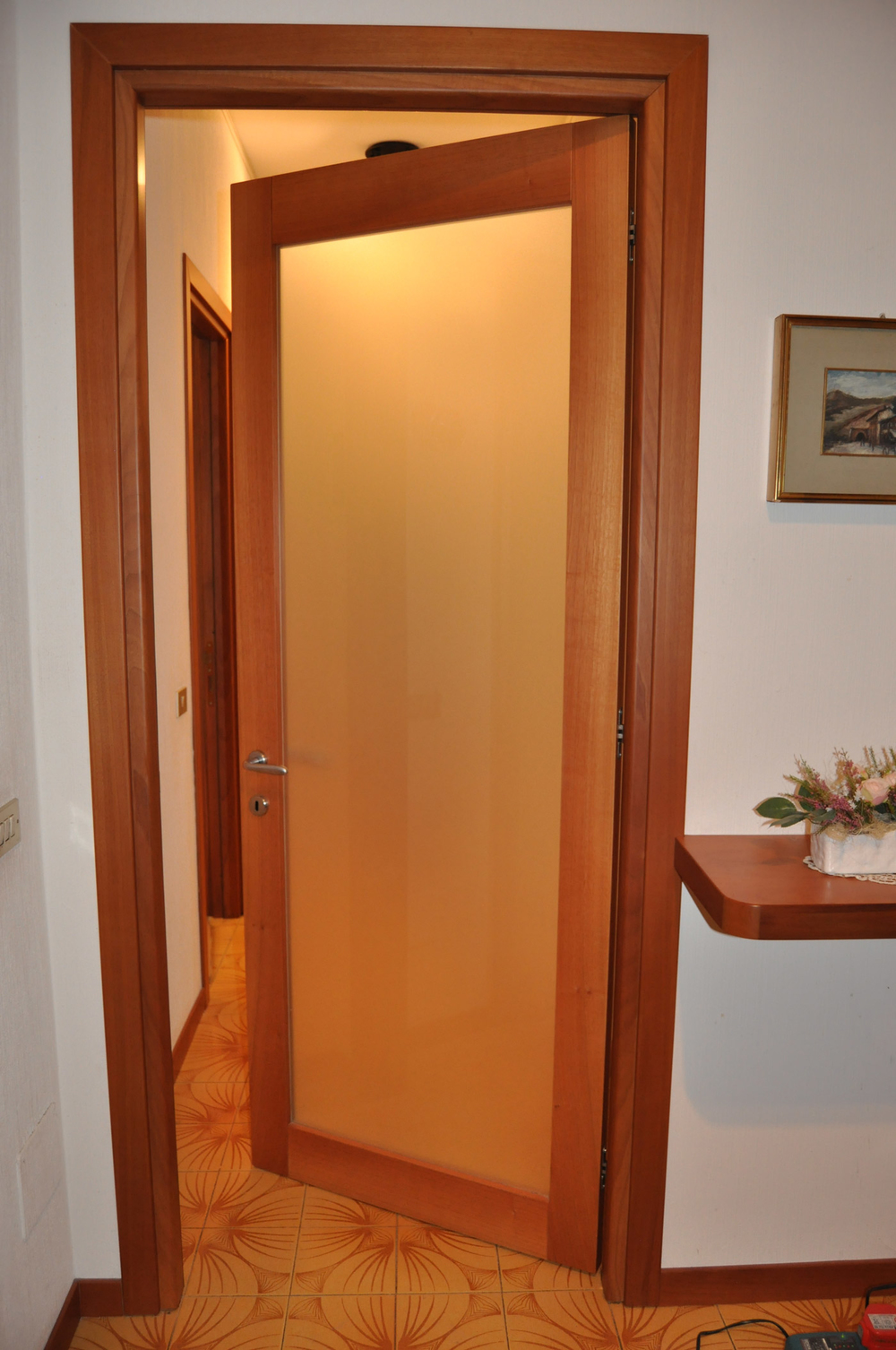 Porta battente con sagoma curva e vetro acidato